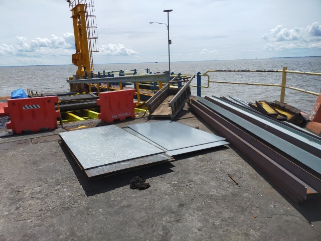 | Sejumlah material terlihat di dermaga dua Roro Air Putih dalam upaya perbaikan pada besi jembatan dermaga yang sudah mengalami kerusakan. |