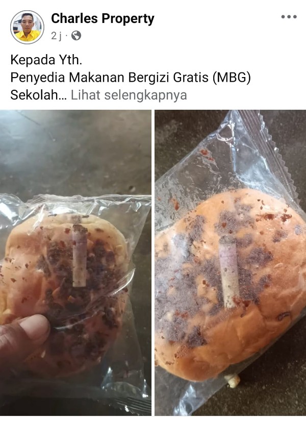 Dalam unggahan itu, Charles mengisahkan pengalaman tidak menyenangkan saat putrinya membawa pulang roti MBG dari sekolah. Awalnya, roti tersebut hendak dikonsumsi seperti biasa, namun rasa curiga muncul ketika kemasan plastik diperiksa lebih teliti.