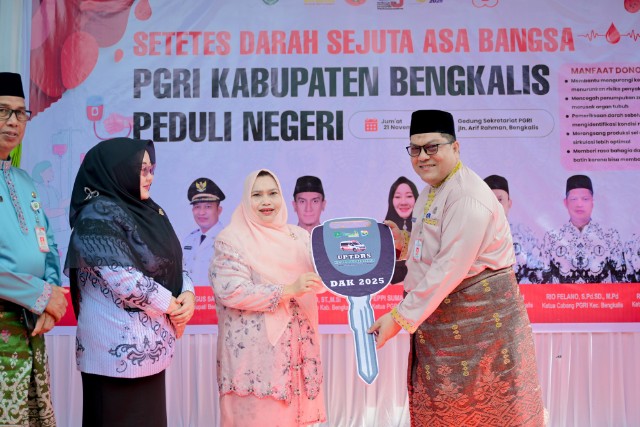 Penyerahan dilakukan di sela kegiatan donor darah yang digelar di Sekretariat PGRI Kabupaten Bengkalis. Mobil ambulans tersebut diterima langsung oleh Direktur RSUD Bengkalis, dr. Azahari Effendi, yang hadir bersama jajaran tenaga kesehatan.