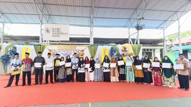 BENGKALIS,Riauline.com - Peringatan Hari Ulang Tahun ke-80 Persatuan Guru Republik Indonesia (PGRI) dan Hari Guru Nasional (HGN) tahun 2025 di Kecamatan Bukit Batu, Kabupaten Bengkalis berlangsung berbeda dari tahun-tahun sebelumnya. Upacara yang digelar di SMA Negeri 1 Bukit Batu, Kamis (27/11/25), menghadirkan suasana haru ketika para pensiunan guru dan tokoh pendiri PGRI kembali diundang, duduk terhormat, dan diberi penghargaan atas dedikasi mereka selama puluhan tahun.